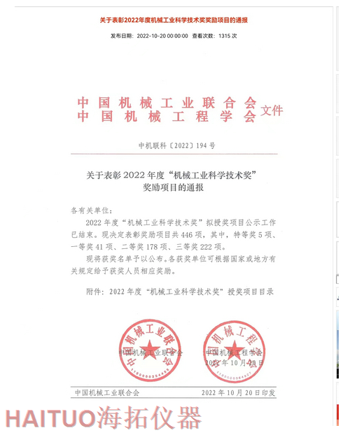 海拓儀器榮獲2022年度中國機械工業(yè)科學技術(shù)獎?ICC訊?10月20日,2022年度“中國機械工業(yè)科學技術(shù)獎”項目名錄正式發(fā)布,由海拓儀器(江蘇)有限公司完成的“超快速冷熱沖擊試驗系統(tǒng)關(guān)鍵技術(shù)研究與系列應用”項目榮獲2022年度“中國機械工業(yè)科學技術(shù)獎”三等獎。??據(jù)了解,中國機械工業(yè)科學技術(shù)獎是根據(jù)《國家科學技術(shù)獎勵條例》和《社會力量設立科學技術(shù)獎管理辦法》的有關(guān)規(guī)定,由中國機械工業(yè)聯(lián)合會和中國機械工程學會共同設立并經(jīng)國家科學技術(shù)部批準,在國家科技獎勵主管部門登記的面向全國機械行業(yè)的綜合性科技獎項。旨在表彰在機械工業(yè)科技工作中作出突出貢獻的單位和人員,獎勵范圍包括:機械工業(yè)科學技術(shù)發(fā)明成果、機械工業(yè)科學技術(shù)進步成果、機械工業(yè)工程化和新技術(shù)推廣成果和機械工業(yè)軟科學和標準成果。??海拓儀器是一家集研發(fā)、制造、貿(mào)易于一體高科技現(xiàn)代化公司,公司成立于2005年,主要產(chǎn)品包括:超快速冷熱沖擊試驗機(熱流儀)、快速溫變應力篩選試驗箱(ESS), -